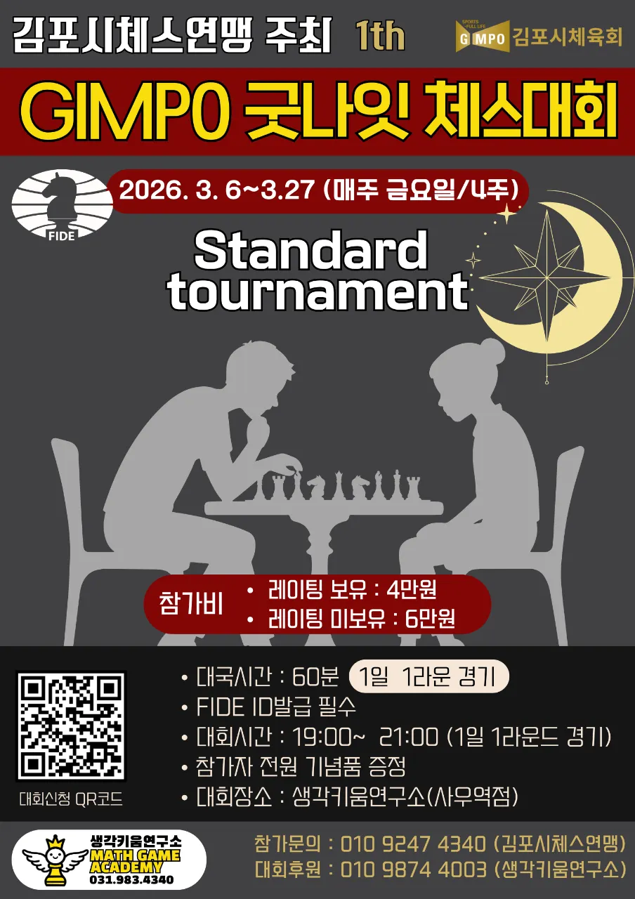 제 1회 김포시체스연맹 회장배 FIDE공인 [굿나잇-스탠다드 체스대회]의 참가 신청을 환영합니다. 참가신청비용 (003-21-0415487 우리은행/ 이수진)에 참가 선수 이름으로 꼭 입금을 먼저 해주시고 설문을 마무리 해주세요. (대회참가비용)-1일 1라운드 경기/ 총 4주간 진행 * 참가신청비용: - FIDE 레이팅 보 유 : 4만원입니다. (1일 15000원/1일만 참여가능) - FIDE 레이팅 미보유 : 6만원입니다.(1일 2만원/1일만 참여가능) (FIDE ID보유와 레이팅 보유는 별개입니다.) (대회 운영 시간) - 3월 6일 ~3월 27일 (매주 금요일 저녁) •19:00 ~ 21:00 [시상] 1등 : 5만원 -(조건 : 승점이 3승 이상) -동일 승점일때는 북홀츠,소네번버거,승수로 1등을 결정 그 외 순위 : 기념품 증정 [주요 안내] -레이팅 1800 미만 (1800이상 선수들)참가 제한 있음 -라운드, 스위스 토너먼트 (총 4라운드 경기만 진행) -각 60분 (5분 미만 기보 작성 없음) -연령 구분이 없는 오픈대회. -대회장 내 주차불가/ 인근 공영주차장 이용 권장 -대회장 내 대기 공간이 없습니다/ 인근 까페 등 이용 권장. [대중 교통 이용 안내] 김포시 골드라인 (김포시청역/ 사우역)-1번 출구에서 도보 5분거리 (서울)당산역(2호선)-(직행 버스) G6003/G6001를 타고 풍년마을에서 하차 **스탠다드 체스대회 접수 마감: 2026년 2월 24일까지 ** **참가비 환불은 2월 25일에 일괄 진행합니다** **2월 25일 이후에는 환불 불가입니다. **환불 시 우리은행을 제외한 타 은행은 수수료 500원을 제외하고 환불 됩니다** 김포시체스연맹 문의: 010-9247-4340 또는 010-9874-4003입니다.