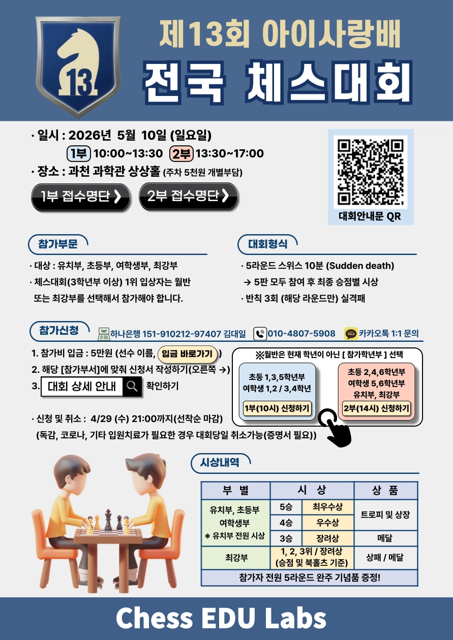 제13회 아이사랑배 체스대회(2026/5/10(일), 과천과학관 상상홀)